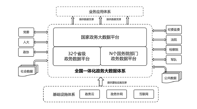 全國一體化政務大數(shù)據(jù)體系包括三類平臺和三大支撐。三類平臺為“1+32+N”框架結(jié)構(gòu)?!?”是指國家政務大數(shù)據(jù)平臺,是我國政務數(shù)據(jù)管理的總樞紐、政務數(shù)據(jù)流轉(zhuǎn)的總通道、政務數(shù)據(jù)服務的總門戶;“32”是指31個省(自治區(qū)、直轄市)和新疆生產(chǎn)建設兵團統(tǒng)籌建設的省級政務數(shù)據(jù)平臺,負責本地區(qū)政務數(shù)據(jù)的目錄編制、供需對接、匯聚整合、共享開放,與國家平臺實現(xiàn)級聯(lián)對接;“N”是指國務院有關部門的政務數(shù)據(jù)平臺,負責本部門本行業(yè)數(shù)據(jù)匯聚整合與供需對接,與國家平臺實現(xiàn)互聯(lián)互通,尚未建設政務數(shù)據(jù)平臺的部門,可由國家平臺提供服務支撐。三大支撐包括管理機制、標準規(guī)范、安全保障三個方面。