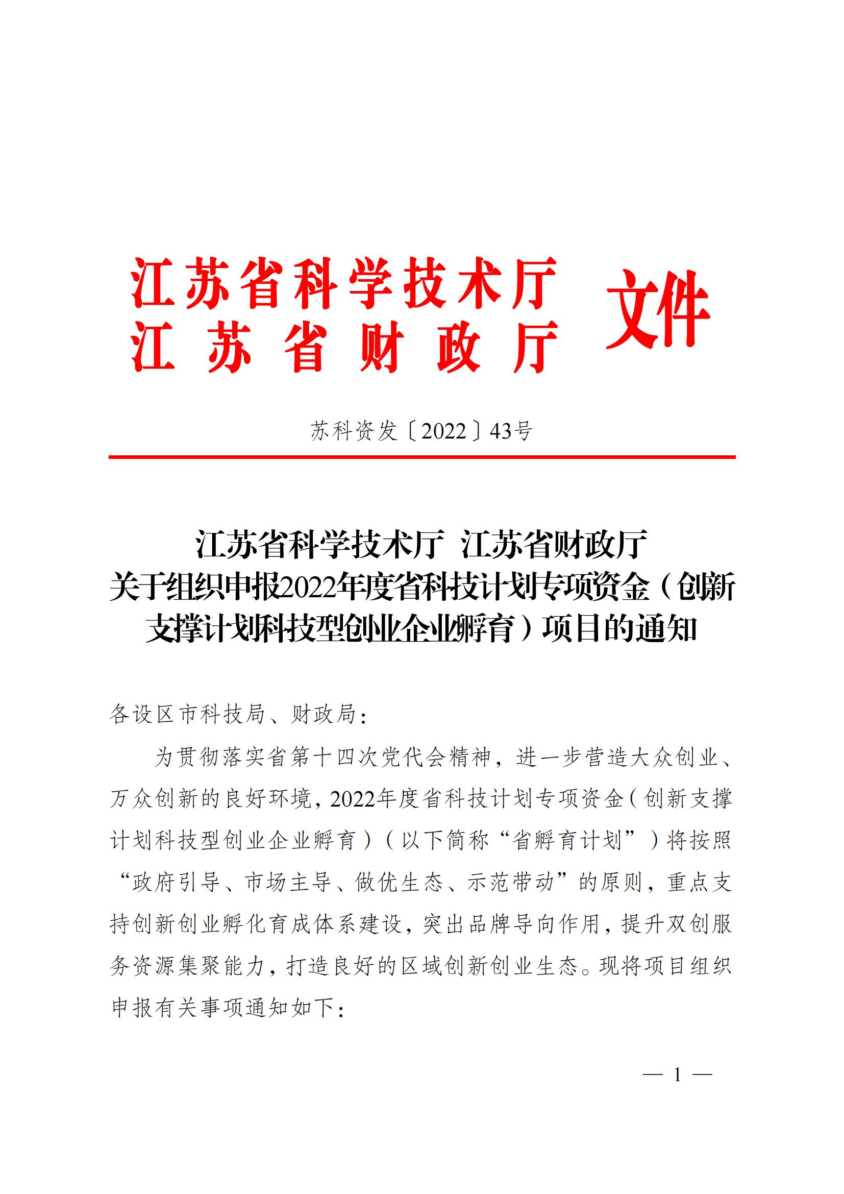 江蘇省科學(xué)技術(shù)廳 江蘇省財政廳關(guān)于組織申報2022年度省科技計劃專項資金(創(chuàng)新支撐計劃科技型創(chuàng)業(yè)企業(yè)孵育)項目的通知
